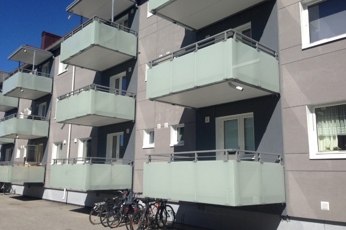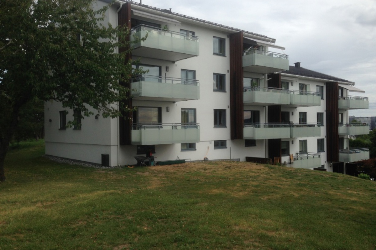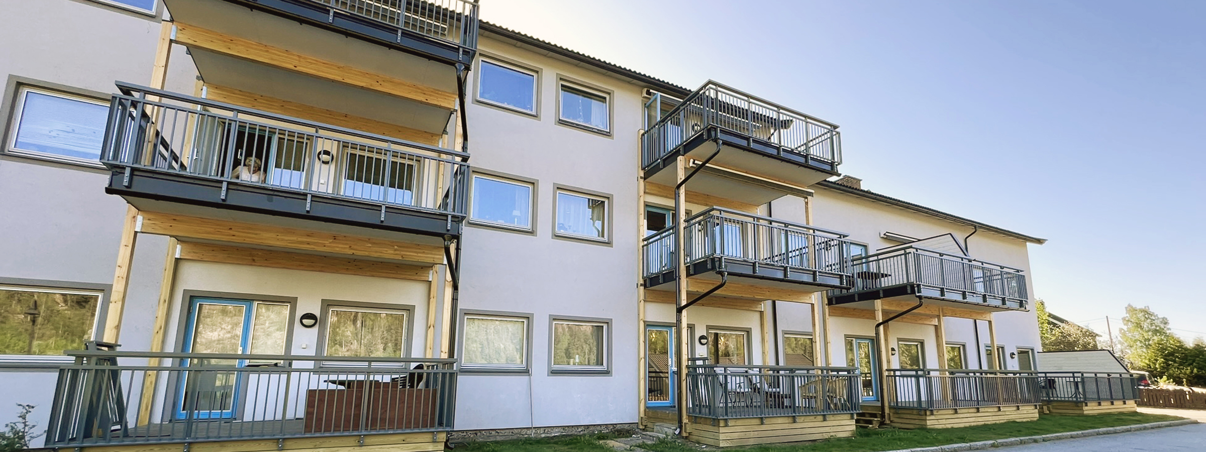 De nye balkongene er en tekket bjelkelagskonstruksjon i impregnert tre, og i samråd med brannkonsulent, ble det montert flammeskjerm i underkant av dekkene. Ønsket fra borettslaget var så vedlikeholdsfrie balkonger som mulig, og sammen har vi kommet fram til gode materialvalg som støtter dette, deriblant kompositt terrassegulv og lakkerte aluminiumsrekkverk.