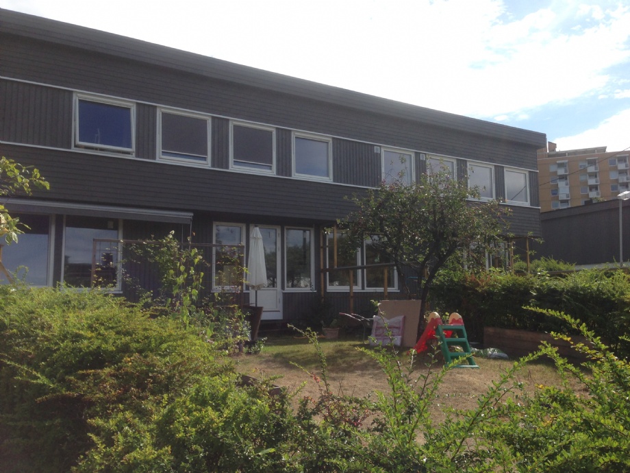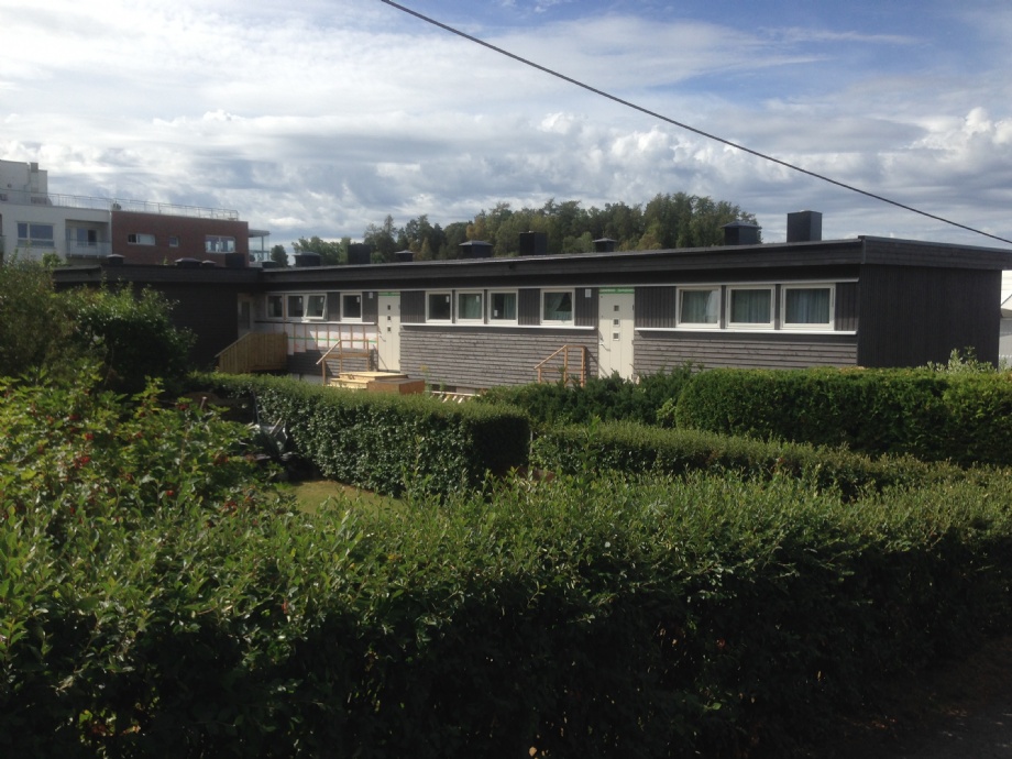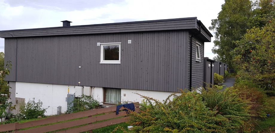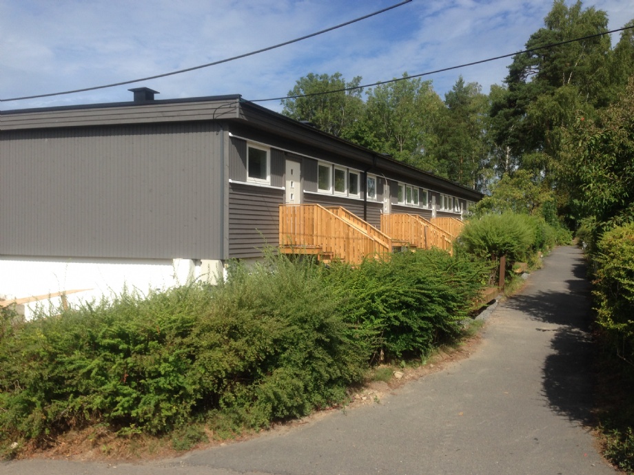 Rehabilitering av alle fasader på rekkehus; nye vinduer og dører, etterisolering og panelkledning. Ny etterisolert takkonstruksjon.