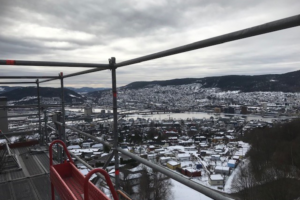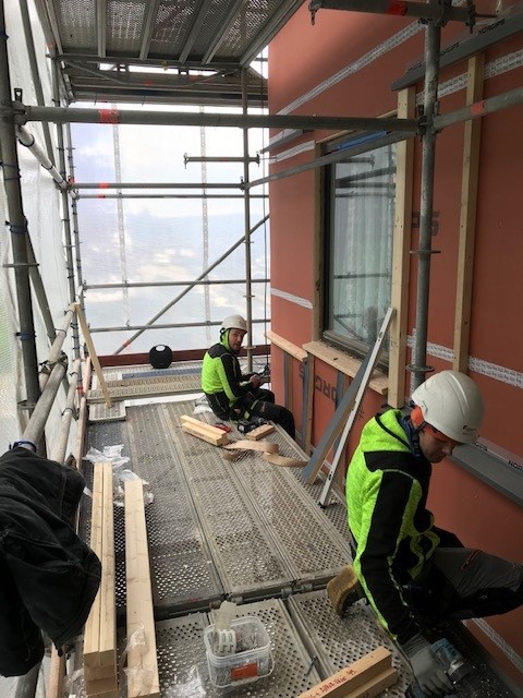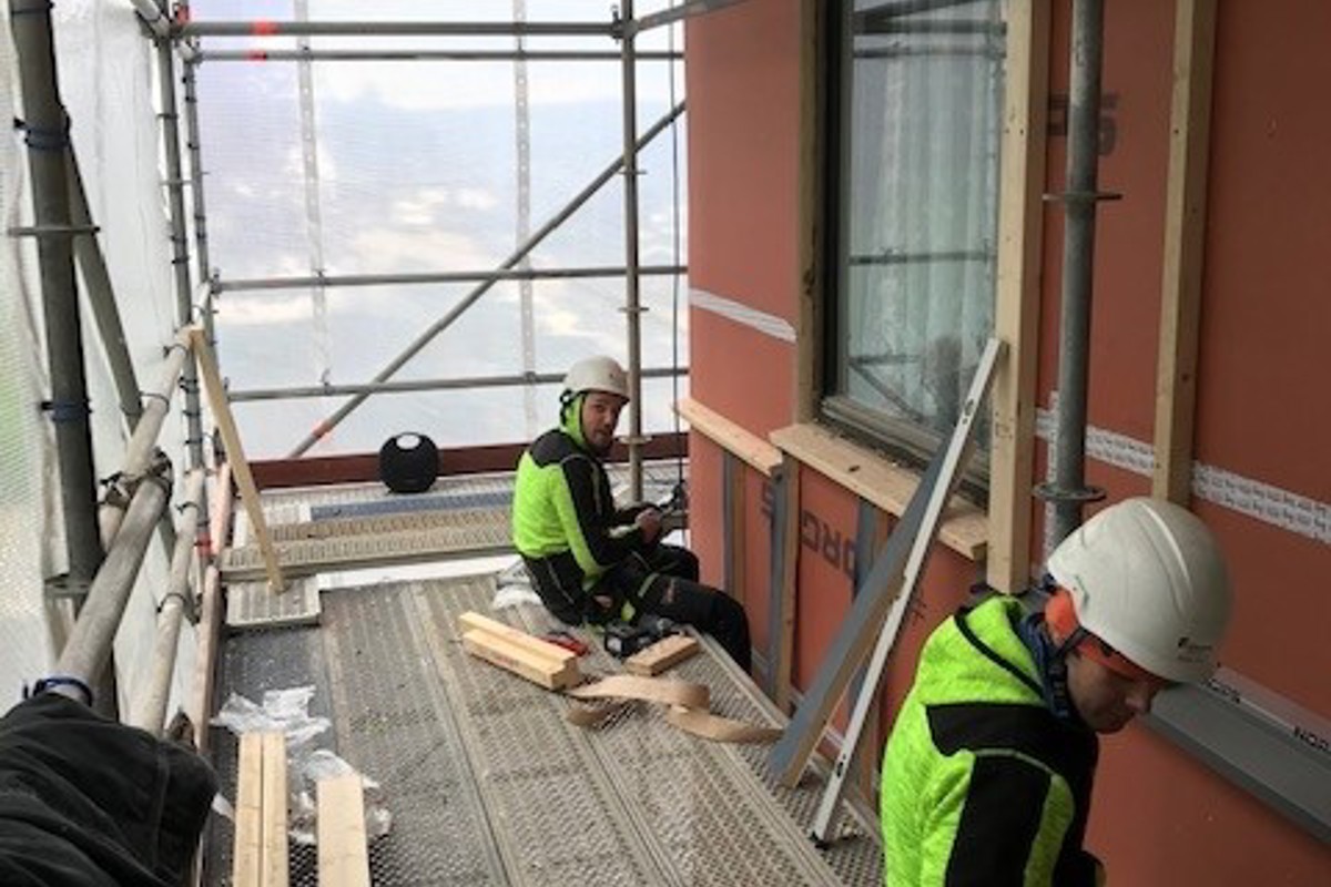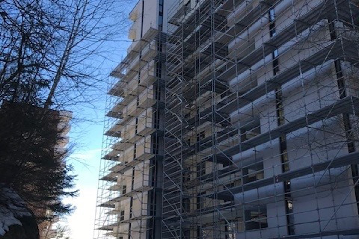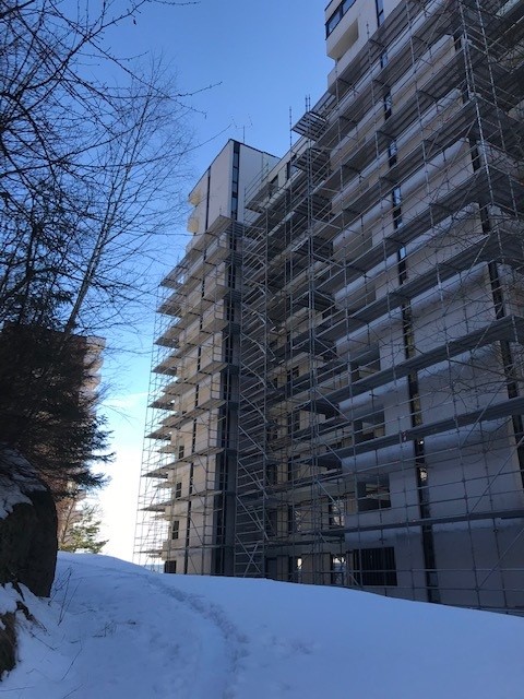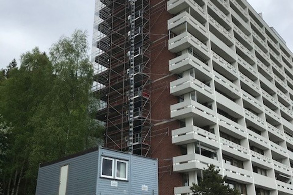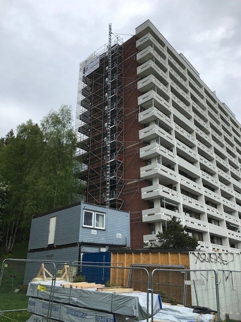 Nye fasadeplater, etterisolering, taktekking samt utskifting av vinduer for 73 leiligheter i høyblokken.